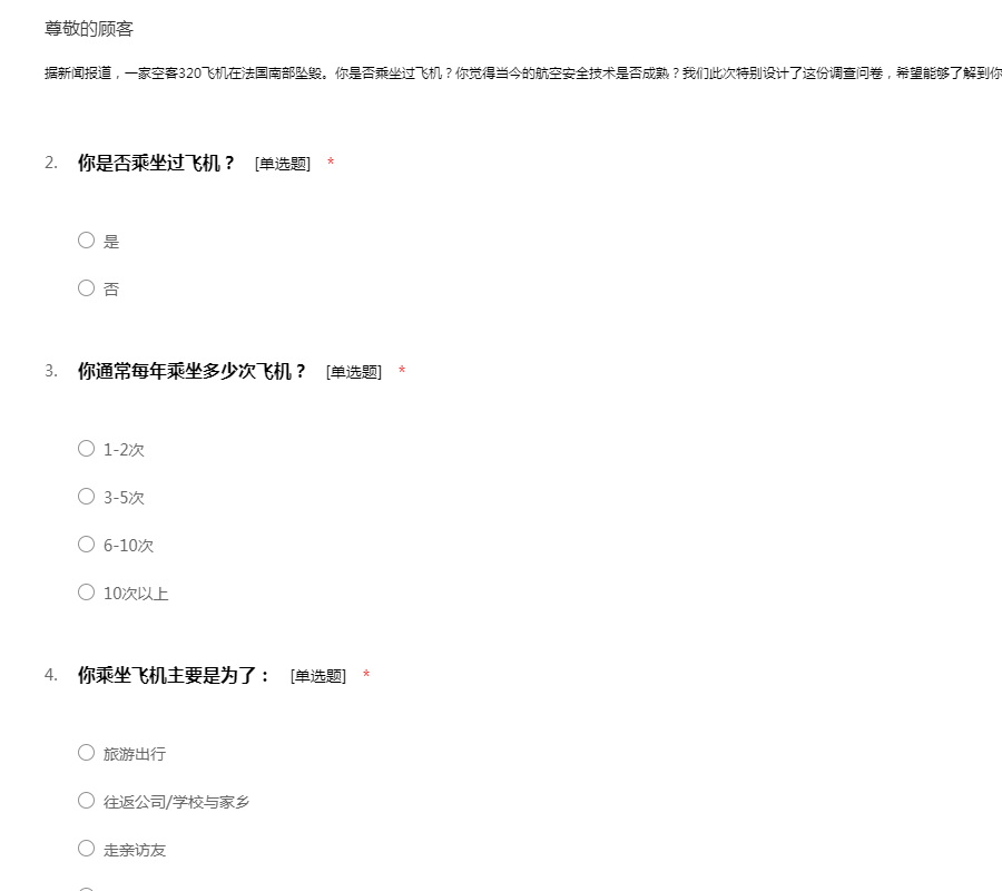 据新闻报道,一家空客320飞机在法国南部坠毁。你是否乘坐过飞机?你觉得当今的航空安全技术是否成熟?我们此次特别设计了这份调查问卷,希望能够了解到你的看法。问卷不记名,感谢你的积极参与!