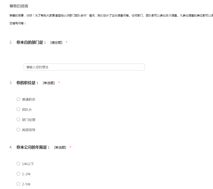 亲爱的同事,你好!为了帮助大家更清楚地认识部门团队合作”情况,我们设计了这份调查问卷。任何部门、团队都可以参加本次调查。凡参加调查的单位都可以得到本单位(部门/团队)的调查结果,非常感谢您填写问卷!