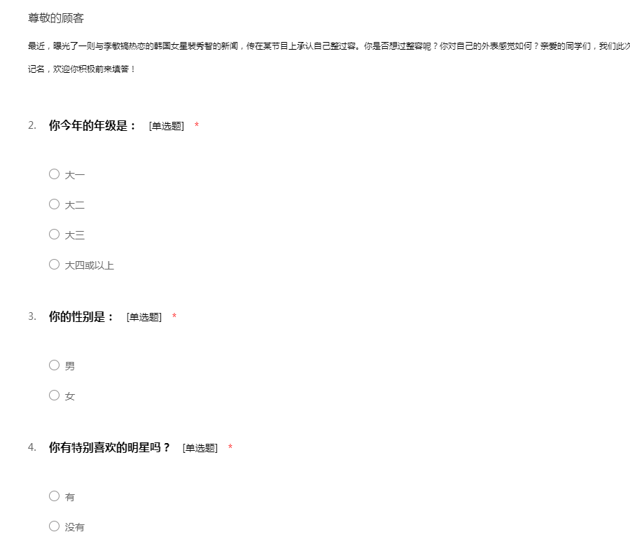 最近,曝光了一则与李敏镐热恋的韩国女星裴秀智的新闻,传在某节目上承认自己整过容。你是否想过整容呢?你对自己的外表感觉如何?亲爱的同学们,我们此次设计了这份调查问卷,需要你们的帮助。问卷不记名,欢迎你积极前来填答!