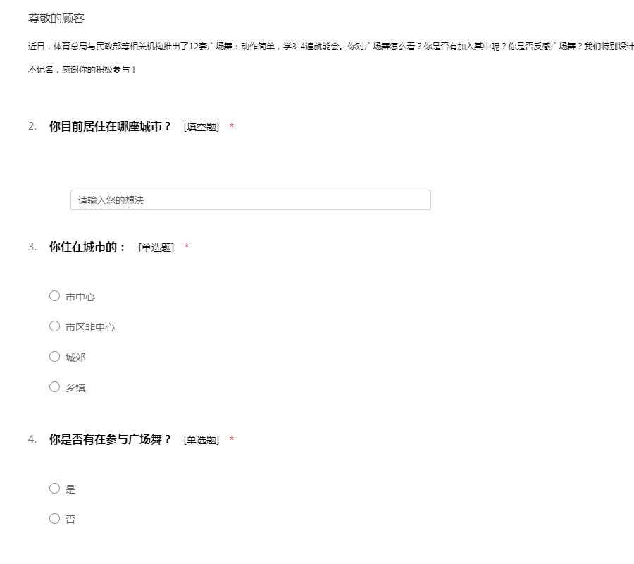 近日,体育总局与民政部等相关机构推出了12套广场舞:动作简单,学3-4遍就能会。你对广场舞怎么看?你是否有加入其中呢?你是否反感广场舞?我们特别设计了这份问卷调查表,希望能得到你的看法。问卷不记名,感谢你的积极参与!