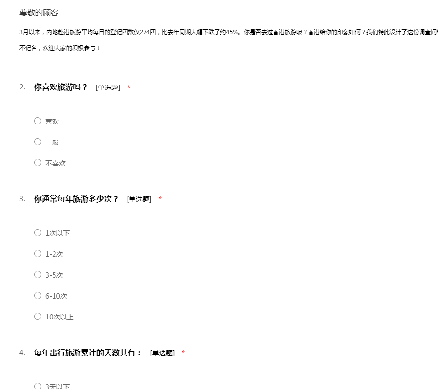 3月以来,内地赴港旅游平均每日的登记团数仅274团,比去年同期大幅下跌了约45%。你是否去过香港旅游呢?香港给你的印象如何?我们特此设计了这份调查问卷,想更多的了解大家对赴港旅游的情况。问卷不记名,欢迎大家的积极参与!