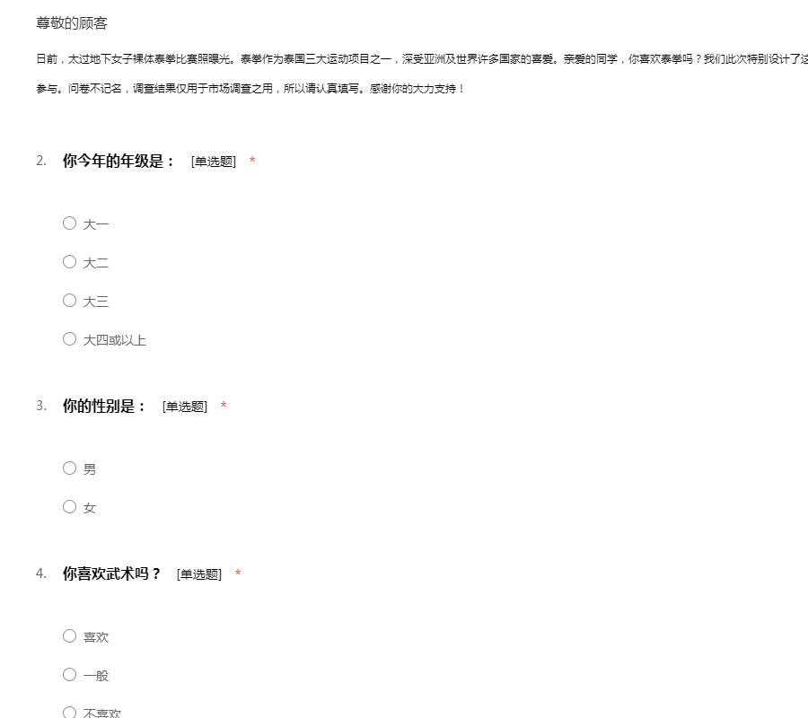 日前,太过地下女子裸体泰拳比赛照曝光。泰拳作为泰国三大运动项目之一,深受亚洲及世界许多国家的喜爱。亲爱的同学,你喜欢泰拳吗?我们此次特别设计了这份关于泰拳喜爱程度的调查问卷,希望你能前来参与。问卷不记名,调查结果仅用于市场调查之用,所以请认真填写。感谢你的大力支持!