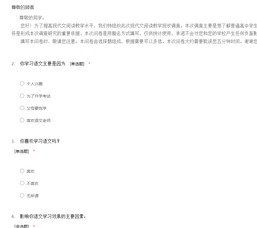 尊敬的同学: 您好!为了提高现代文阅读教学水平,我们特组织此次现代文阅读教学现状调查。本次调查主要是想了解普通高中学生的现代文阅读学习现状,您的回答将是形成本次调查研究的重要依据。本次问卷是用匿名方式填写,仅供统计使用,承诺不会对您和您的学校产生任何负面影响,敬请您如实填写。 填写本问卷时,敬请您注意:本问卷由选择题组成,根据需要可以多选。本次问卷大约需要耽误您五分钟时间。谢谢您的合作!