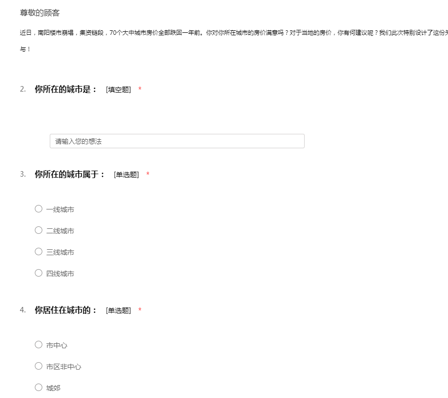 近日,南阳楼市崩塌,集资链段,70个大中城市房价全部跌回一年前。你对你所在城市的房价满意吗?对于当地的房价,你有何建议呢?我们此次特别设计了这份关于房价的满意度调查问卷,欢迎你的积极参与!
