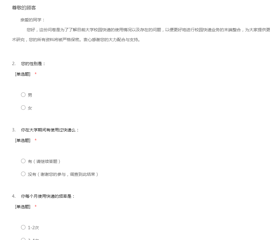 亲爱的同学: 您好,这份问卷是为了了解目前大学校园快递的使用情况以及存在的问题,以便更好地进行校园快递业务的末端整合,为大家提供更好的服务。这次调查的所有数据仅用于学术研究,您的所有资料将被严格保密。衷心感谢您的大力配合与支持。