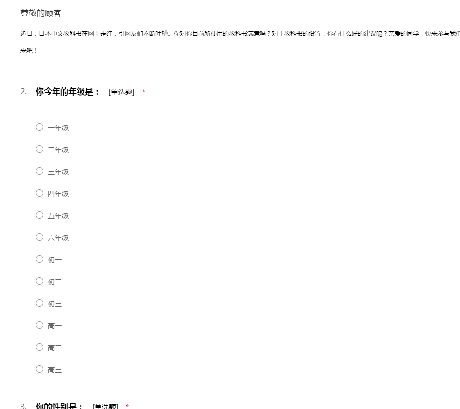 近日,日本中文教科书在网上走红,引网友们不断吐槽。你对你目前所使用的教科书满意吗?对于教科书的设置,你有什么好的建议呢?亲爱的同学,快来参与我们此次的调查问卷,把你对教科书的看法都吐槽出来吧!