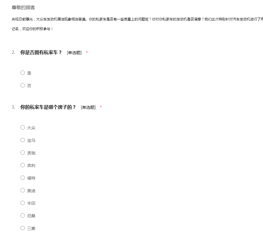 央视日前曝光,大众车发动机漏油现象相当普遍。你的私家车是否有一些质量上的问题呢?你对你私家车的发动机是否满意?我们此次特别针对汽车发动机进行了用户满意度的调查,设计了这份调查问卷。问卷不记名,欢迎你的积极参与!