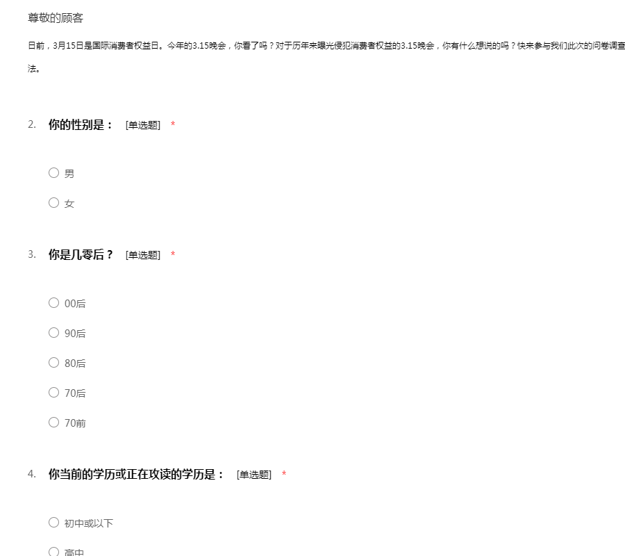 日前,3月15日是国际消费者权益日。今年的3.15晚会,你看了吗?对于历年来曝光侵犯消费者权益的3.15晚会,你有什么想说的吗?快来参与我们此次的问卷调查吧!此次问卷不记名,仅是想了解大家对此的看法。
