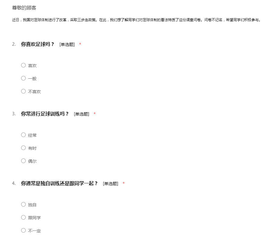 近日,我国对足球体制进行了改革,采取三步走政策。在此,我们想了解同学们对足球体制的看法特质了这份调查问卷。问卷不记名,希望同学们积极参与。