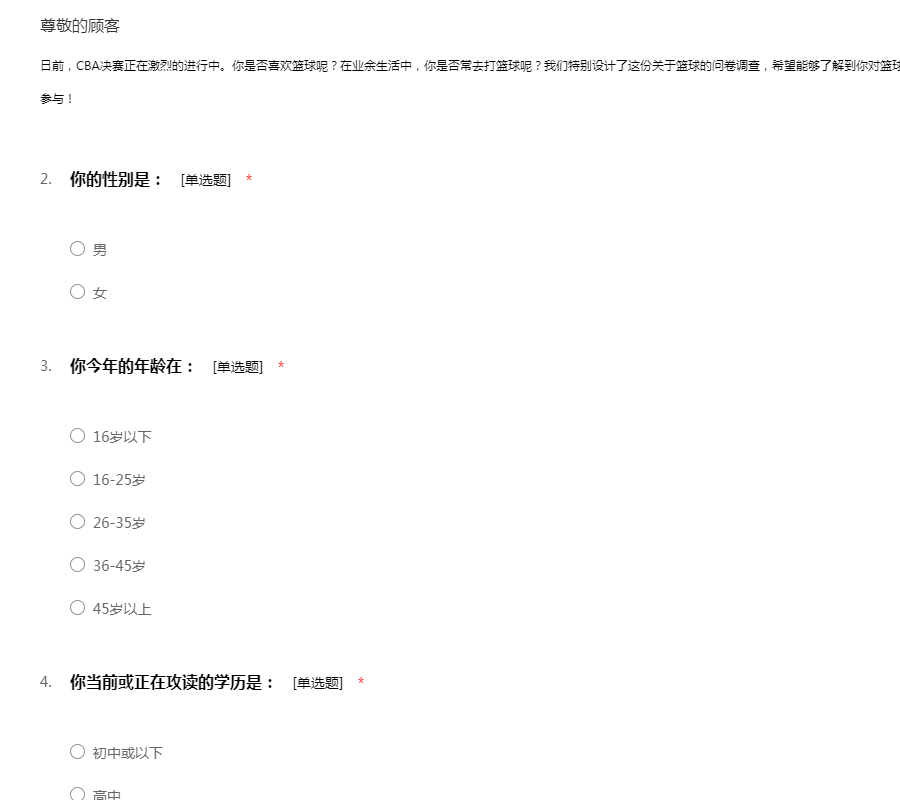 日前,CBA决赛正在激烈的进行中。你是否喜欢篮球呢?在业余生活中,你是否常去打篮球呢?我们特别设计了这份关于篮球的问卷调查,希望能够了解到你对篮球的喜爱程度。问卷不记名,欢迎小伙伴们的积极参与!