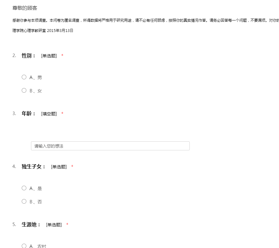 感谢你参与本项调查。本问卷为匿名调查,所得数据将严格用于研究用途,请不必有任何顾虑,按照你的真实情况作答。请务必回答每一个问题,不要漏项。对你的参与和配合表示衷心感谢! 北京中医药大学管理学院心理学教研室 2015年3月13日