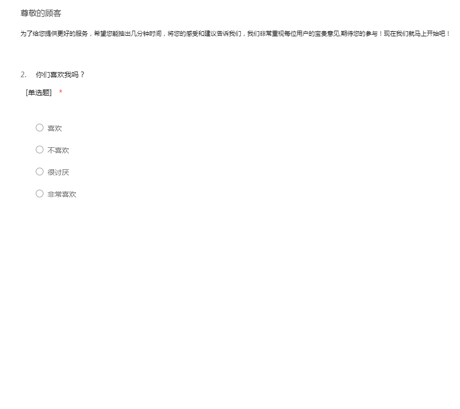 为了给您提供更好的服务,希望您能抽出几分钟时间,将您的感受和建议告诉我们,我们非常重视每位用户的宝贵意见,期待您的参与!现在我们就马上开始吧!