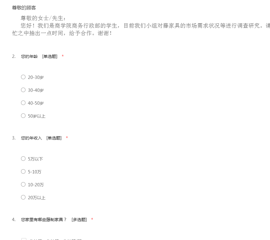 尊敬的女士/先生: 您好!我们是商学院商务行政部的学生,目前我们小组对藤家具的市场需求状况等进行调查研究。请您如实回答问题。感谢您在百忙之中抽出一点时间,给予合作。谢谢!