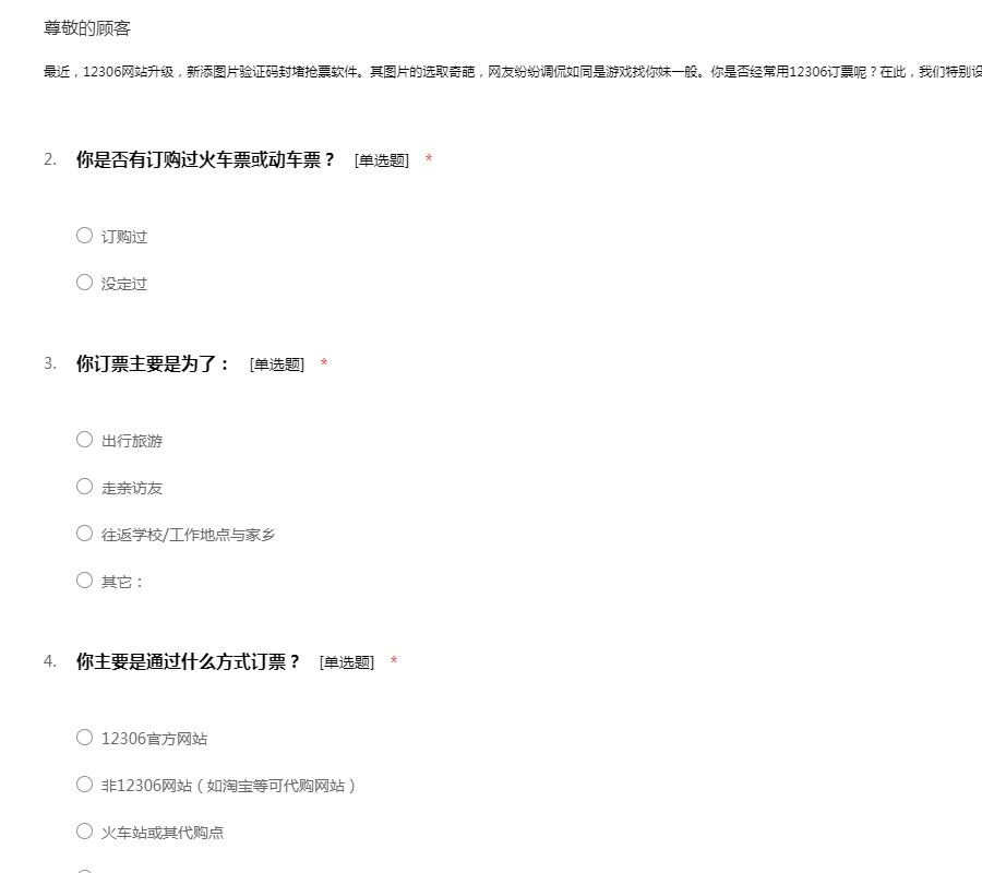 最近,12306网站升级,新添图片验证码封堵抢票软件。其图片的选取奇葩,网友纷纷调侃如同是游戏找你妹一般。你是否经常用12306订票呢?在此,我们特别设计了这份调查问卷,希望能够听到你的建议。