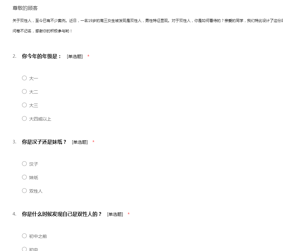 关于双性人,至今已有不少案例。近日,一名19岁的高三女生被发现是双性人,男性特征显现。对于双性人,你是如何看待的?亲爱的同学,我们特此设计了这份调查问卷,希望能够了解到你对双性人的看法。问卷不记名,感谢你的积极参与哟!