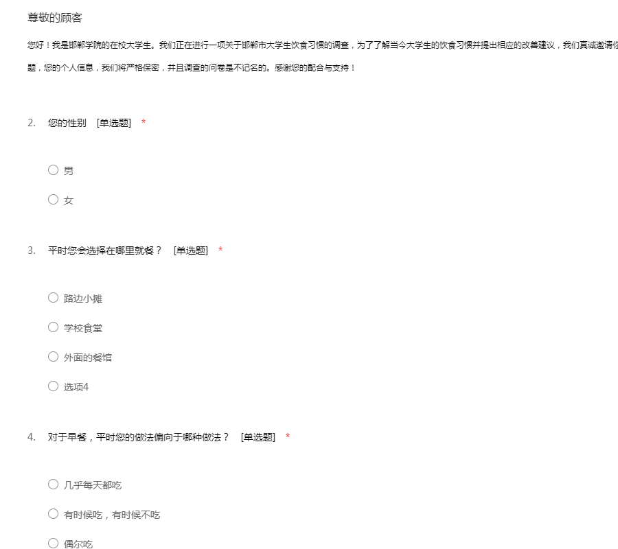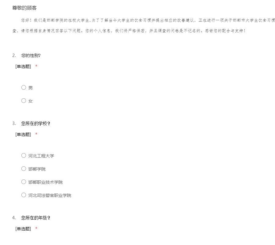 您好!我是邯郸学院的在校大学生。我们正在进行一项关于邯郸市大学生饮食习惯的调查,为了了解当今大学生的饮食习惯并提出相应的改善建议,我们真诚邀请你参与此次调查。请您根据自身情况回答以下问题,您的个人信息,我们将严格保密,并且调查的问卷是不记名的。感谢您的配合与支持!