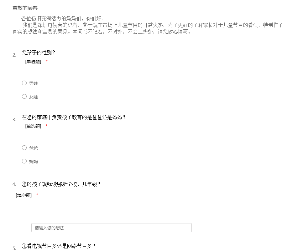 各位仍旧充满活力的妈妈们,你们好: 我们是深圳电视台的记者,鉴于现在市场上儿童节目的日益火热,为了更好的了解家长对于儿童节目的看法,特制作了本份调查问卷,希望能得到您们最真实的想法和宝贵的意见。本问卷不记名,不对外,不会上头条,请您放心填写。