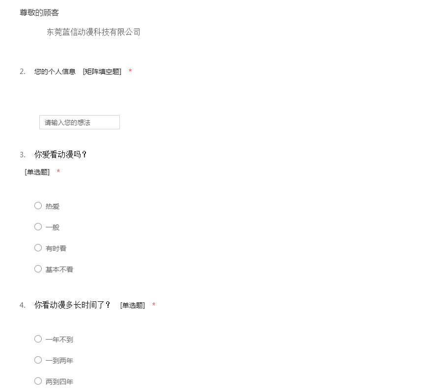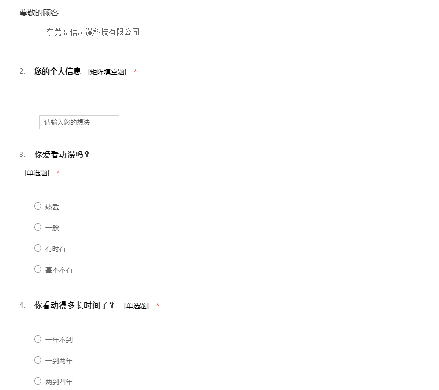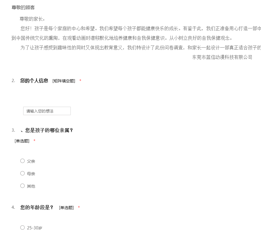 尊敬的家长: 您好!孩子是每个家庭的中心和希望。我们希望每个孩子都能健康快乐的成长。有鉴于此,我们正准备用心打造一部中医药题材的动画,让孩子从小就受到中国传统文化的熏陶,在观看动画时潜移默化地培养健康和自我保健意识。从小树立良好的自我保健观念。 为了让孩子感受到趣味性的同时又体现出教育意义,我们特设计了此份问卷调查,和家长一起设计一部真正适合孩子的优秀动漫。 东莞市蓝信动漫科技有限公司