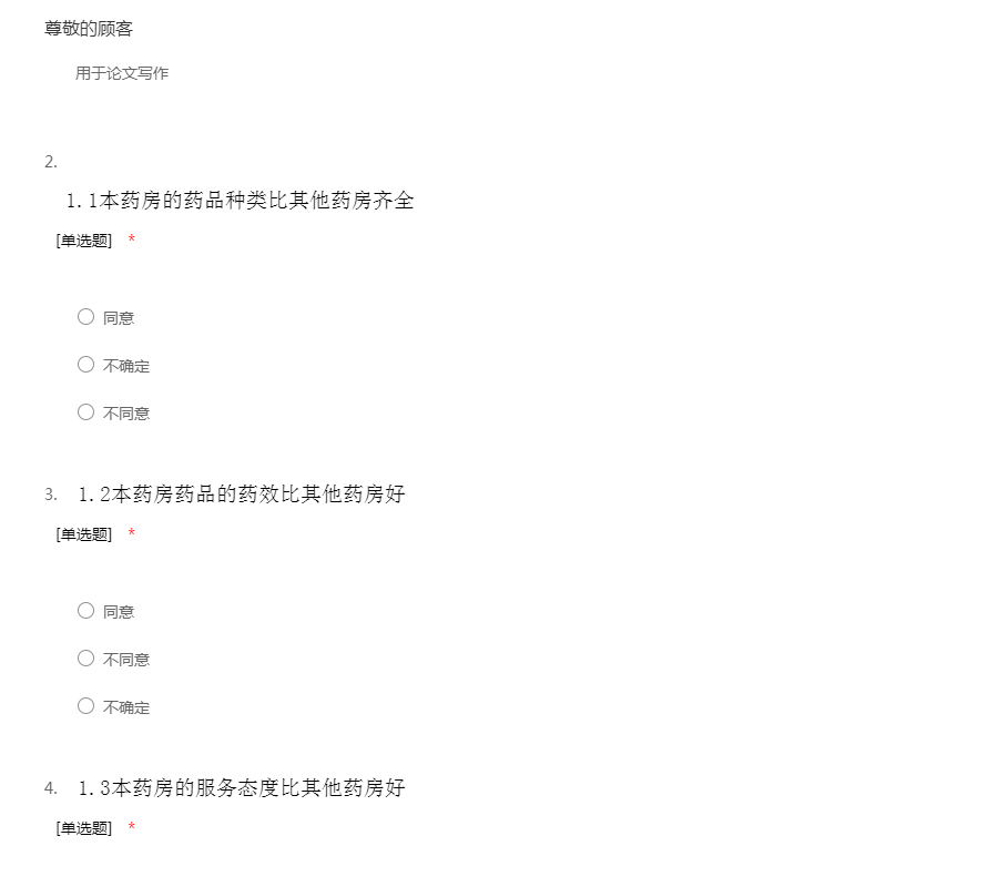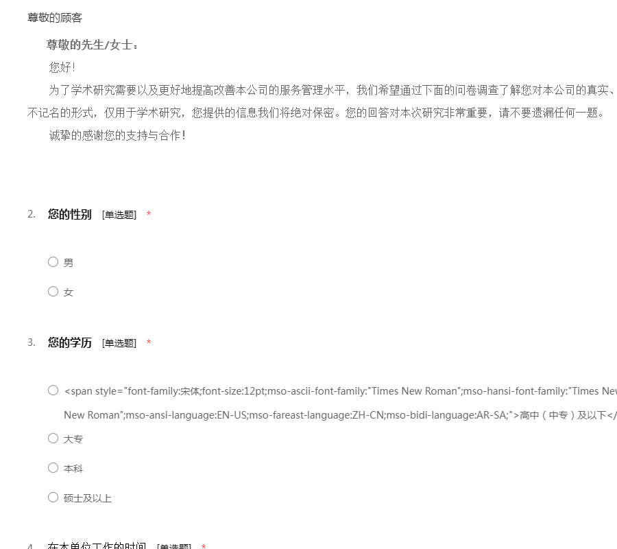 尊敬的先生/女士: 您好! 为了学术研究需要以及更好地提高改善本公司的服务管理水平,我们希望通过下面的问卷调查了解您对本公司的真实、客观想法。本次调查问卷采用的是不记名的形式,仅用于学术研究,您提供的信息我们将绝对保密。您的回答对本次研究非常重要,请不要遗漏任何一题。 诚挚的感谢您的支持与合作!