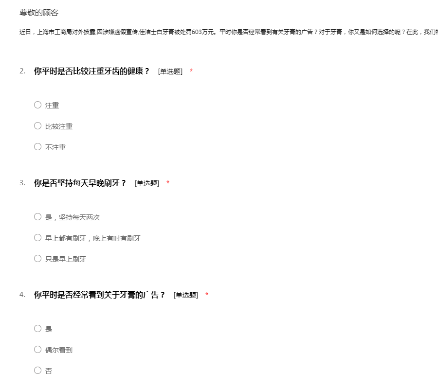 近日,上海市工商局对外披露,因涉嫌虚假宣传,佳洁士白牙膏被处罚603万元。平时你是否经常看到有关牙膏的广告?对于牙膏,你又是如何选择的呢?在此,我们特备设计了这份调查问卷,欢迎你的参与!