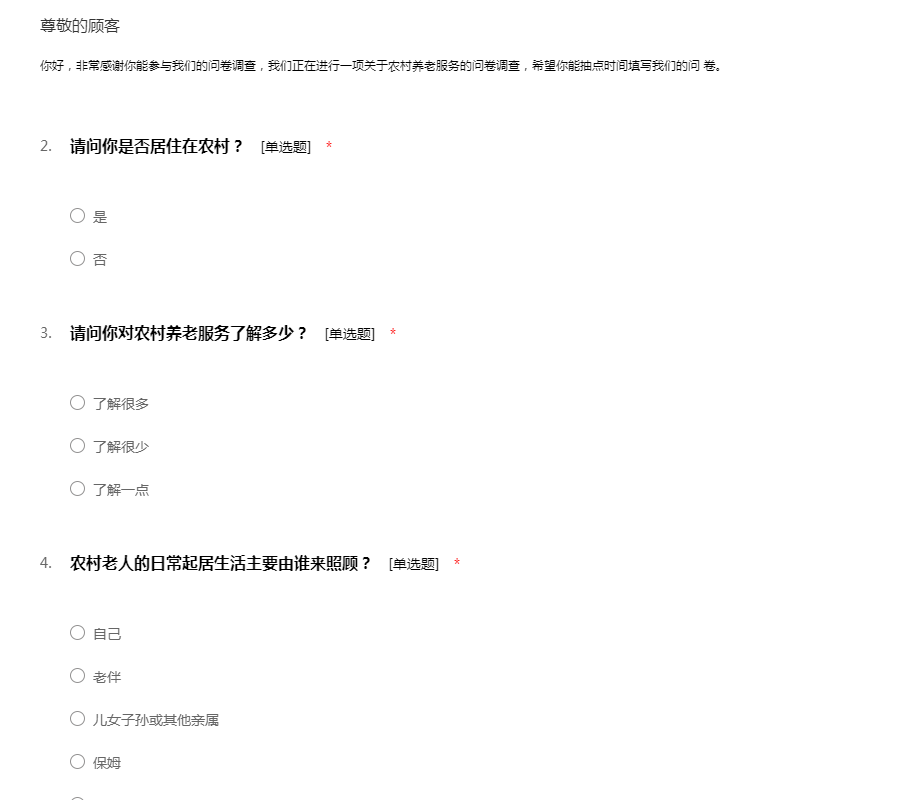 你好,非常感谢你能参与我们的问卷调查,我们正在进行一项关于农村养老服务的问卷调查,希望你能抽点时间填写我们的问 卷。