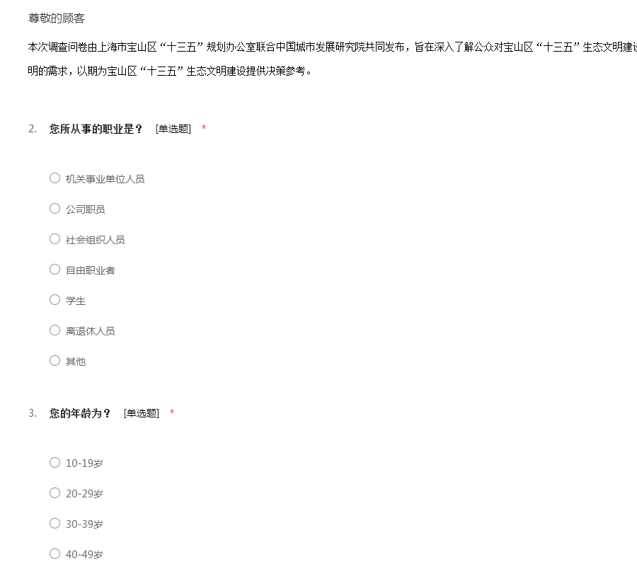 本次调查问卷由上海市宝山区“十三五”规划办公室联合中国城市发展研究院共同发布,旨在深入了解公众对宝山区“十三五”生态文明建设的看法、意愿以及公众对宝山区生态文明的需求,以期为宝山区“十三五”生态文明建设提供决策参考。