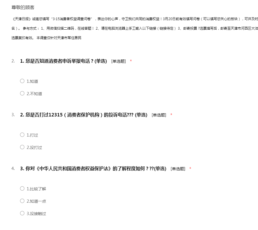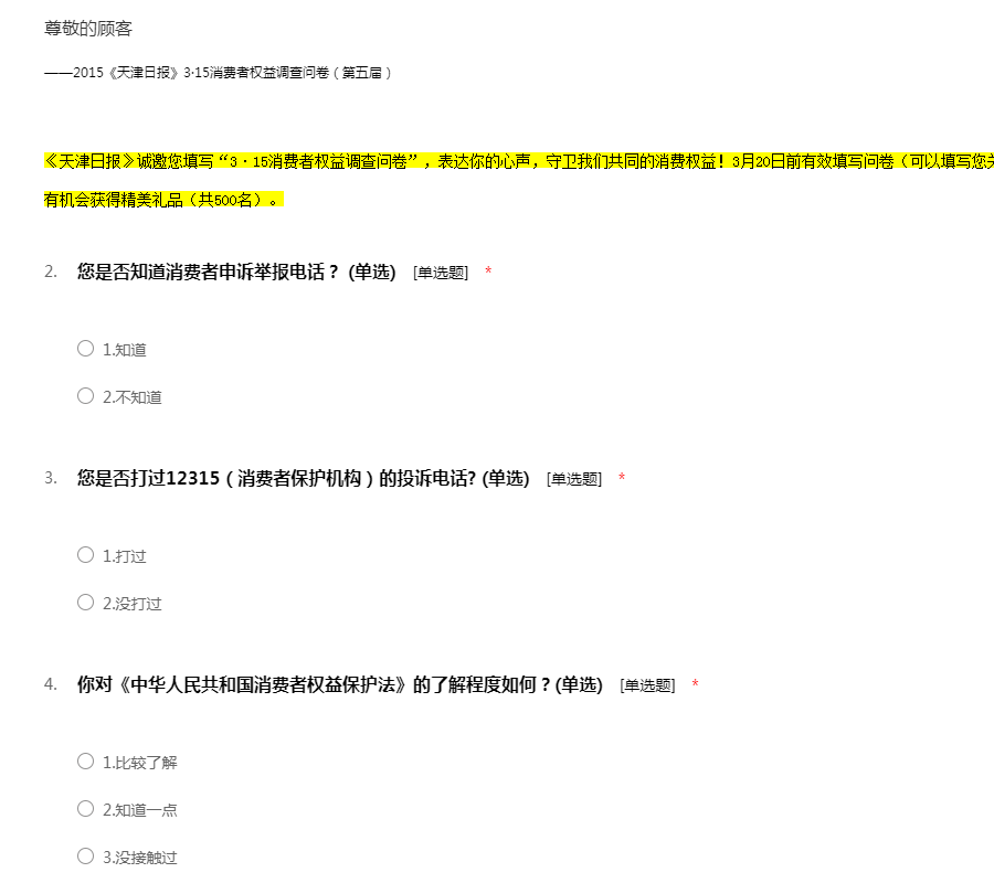——2015《天津日报》3·15消费者权益调查问卷(第五届)
