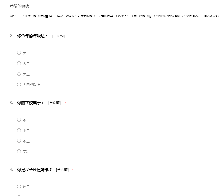 两会上,“任性”翻译姐张蕾走红。据说,她老公是习大大的翻译。亲爱的同学,你是否想过成为一名翻译呢?快来把你的想法留在这份调查问卷里。问卷不记名,表担心~~感谢你的积极参与哟~~