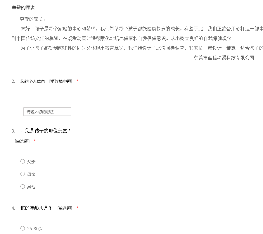 尊敬的家长: 您好!孩子是每个家庭的中心和希望。我们希望每个孩子都能健康快乐的成长。有鉴于此,我们正准备用心打造一部中医药题材的动画,让孩子从小就受到中国传统文化的熏陶,在观看动画时潜移默化地培养健康和自我保健意识。从小树立良好的自我保健观念。 为了让孩子感受到趣味性的同时又体现出教育意义,我们特设计了此份问卷调查,和家长一起设计一部真正适合孩子的优秀动漫。 东莞市蓝信动漫科技有限公司