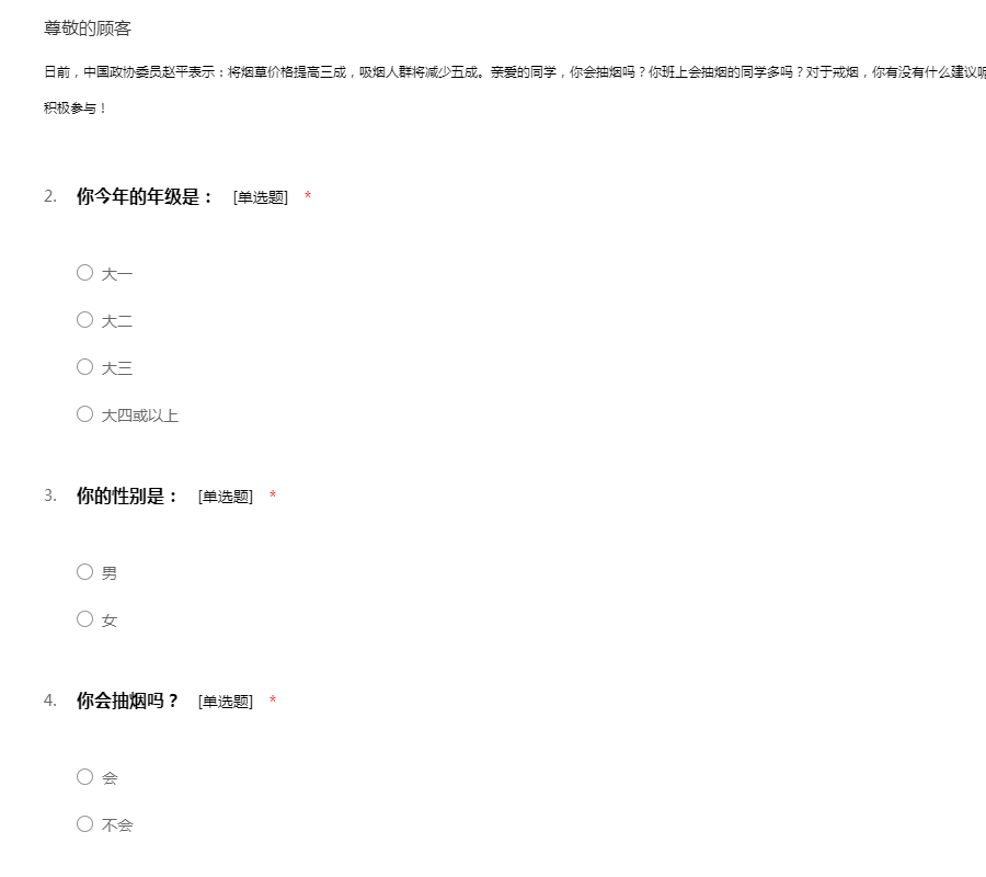 日前,中国政协委员赵平表示:将烟草价格提高三成,吸烟人群将减少五成。亲爱的同学,你会抽烟吗?你班上会抽烟的同学多吗?对于戒烟,你有没有什么建议呢?在此,我们设计了这份调查问卷,希望你能够积极参与!