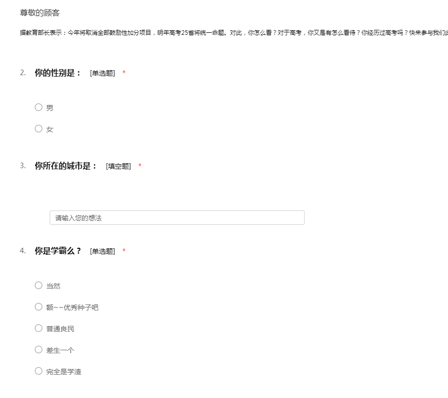 据教育部长表示:今年将取消全部鼓励性加分项目,明年高考25省将统一命题。对此,你怎么看?对于高考,你又是有怎么看待?你经历过高考吗?快来参与我们此次的调查问卷,把你的看法都留下来吧!