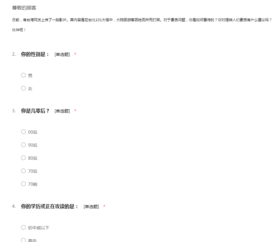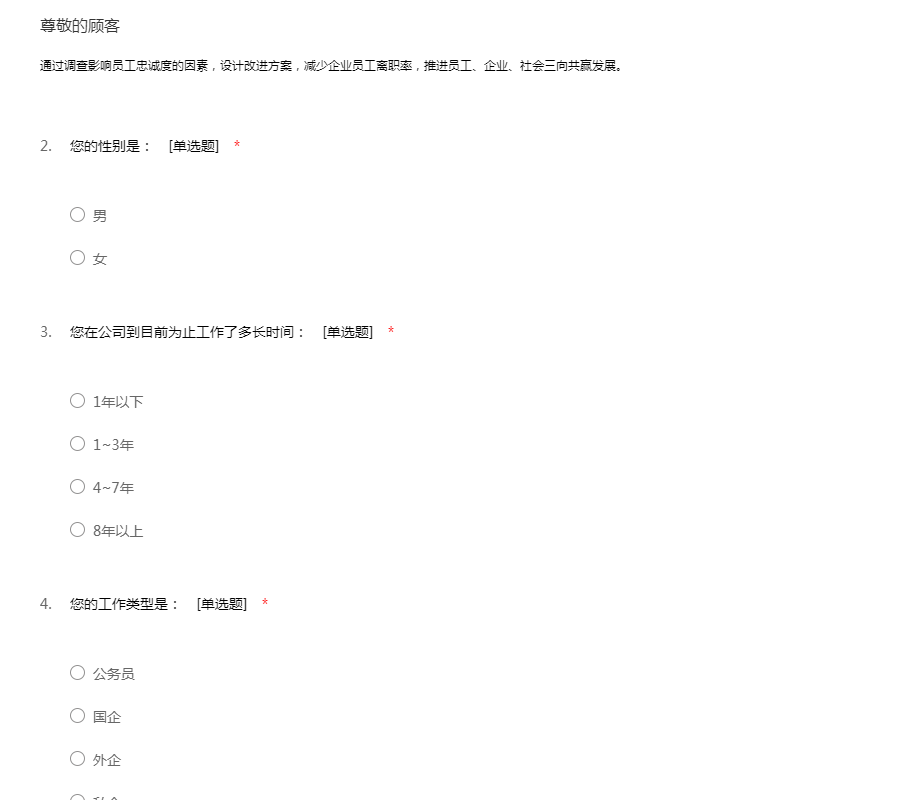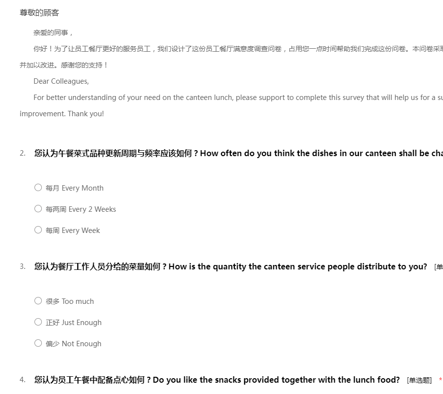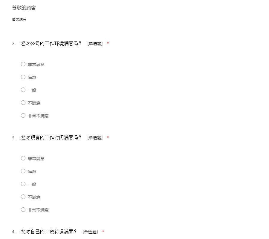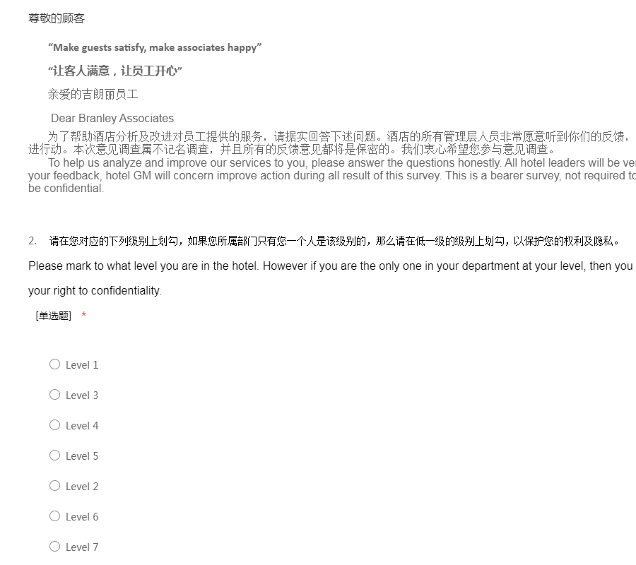 为了帮助酒店分析及改进对员工提供的服务,请据实回答下述问题。酒店的所有管理层人员非常愿意听到你们的反馈,总经理会依据意见调查的结果采取改进行动。本次意见调查属不记名调查,并且所有的反馈意见都将是保密的。我们衷心希望您参与意见调查。