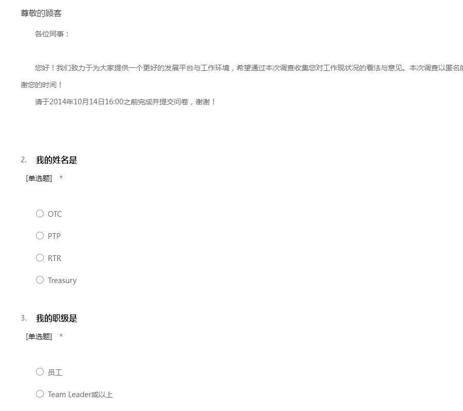 各位同事: 您好!我们致力于为大家提供一个更好的发展平台与工作环境,希望通过本次调查收集您对工作现状况的看法与意见。本次调查以匿名的形式进行,欢迎您分享真实的想法,谢谢您的时间! 请于2014年10月14日16:00之前完成并提交问卷,谢谢!