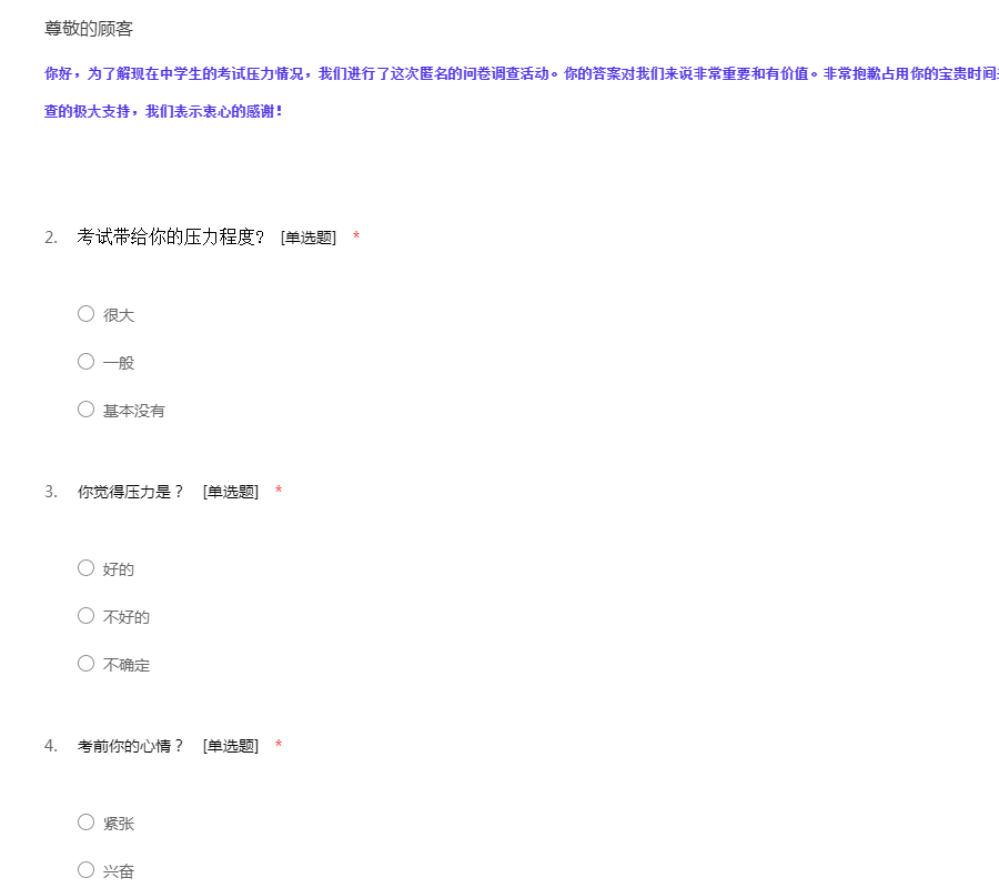你好,为了解现在中学生的考试压力情况,我们进行了这次匿名的问卷调查活动。你的答案对我们来说非常重要和有价值。非常抱歉占用你的宝贵时间来填写我们的问卷,你的认真填写是对我们调查的极大支持,我们表示衷心的感谢!