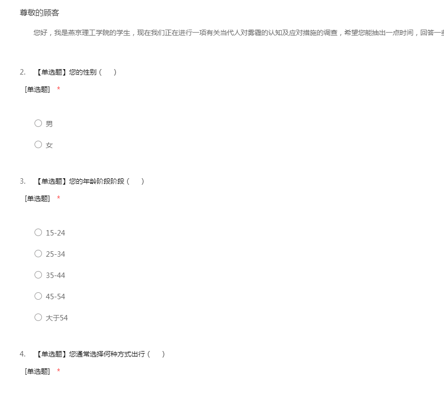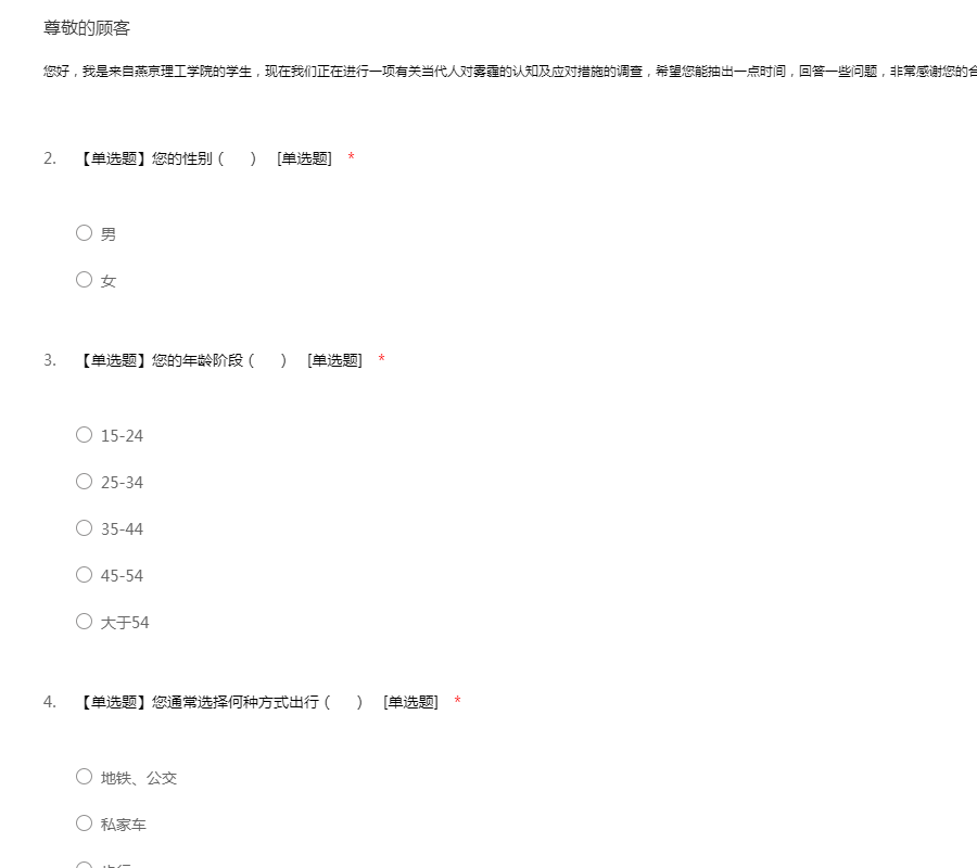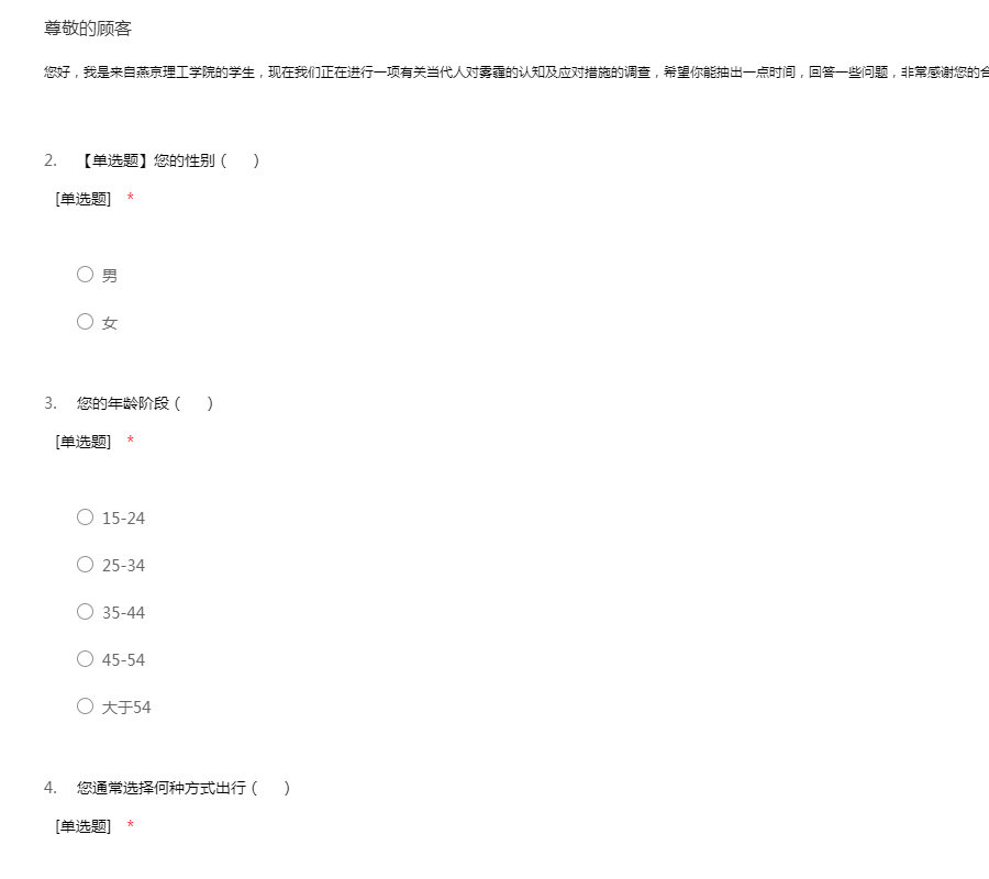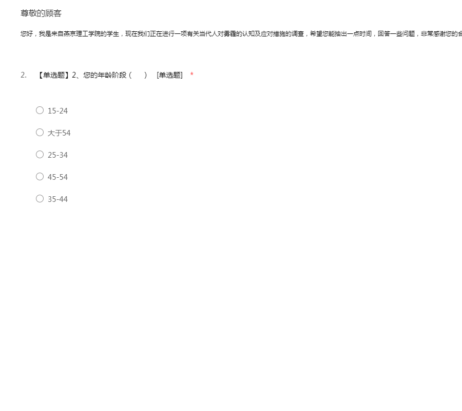 您好,我是来自燕京理工学院的学生,现在我们正在进行一项有关当代人对雾霾的认知及应对措施的调查,希望您能抽出一点时间,回答一些问题,非常感谢您的合作与支持。