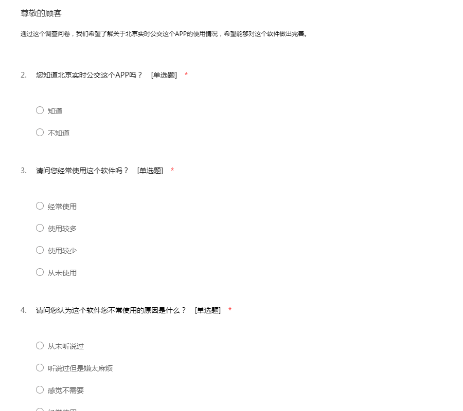 通过这个调查问卷,我们希望了解关于北京实时公交这个APP的使用情况,希望能够对这个软件做出完善。