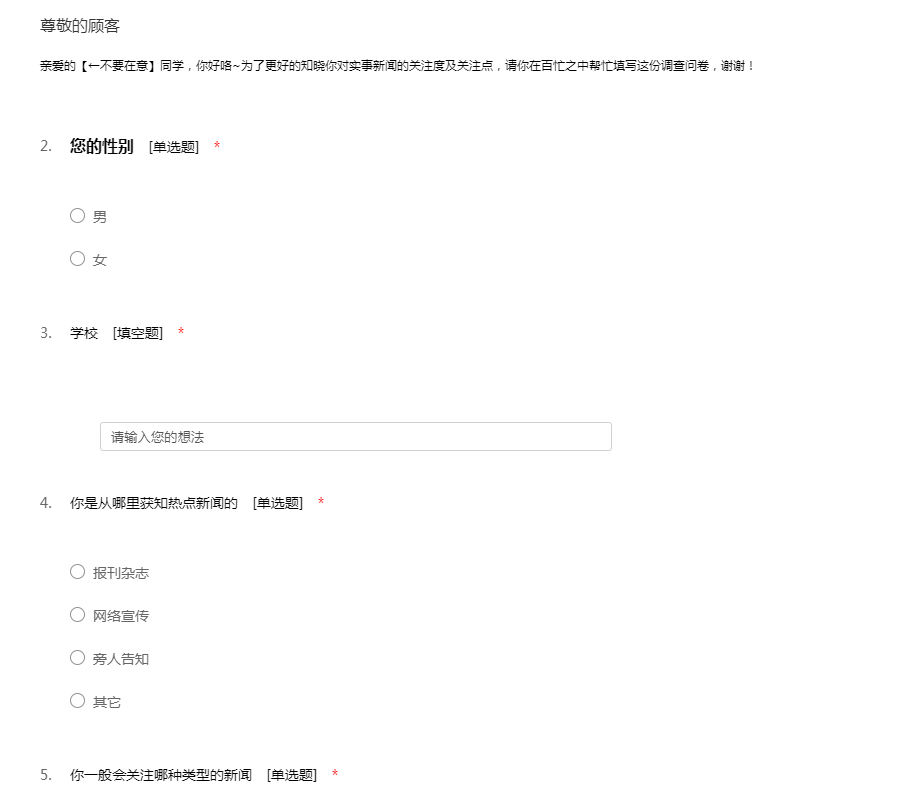 亲爱的【←不要在意】同学,你好咯~为了更好的知晓你对实事新闻的关注度及关注点,请你在百忙之中帮忙填写这份调查问卷,谢谢!