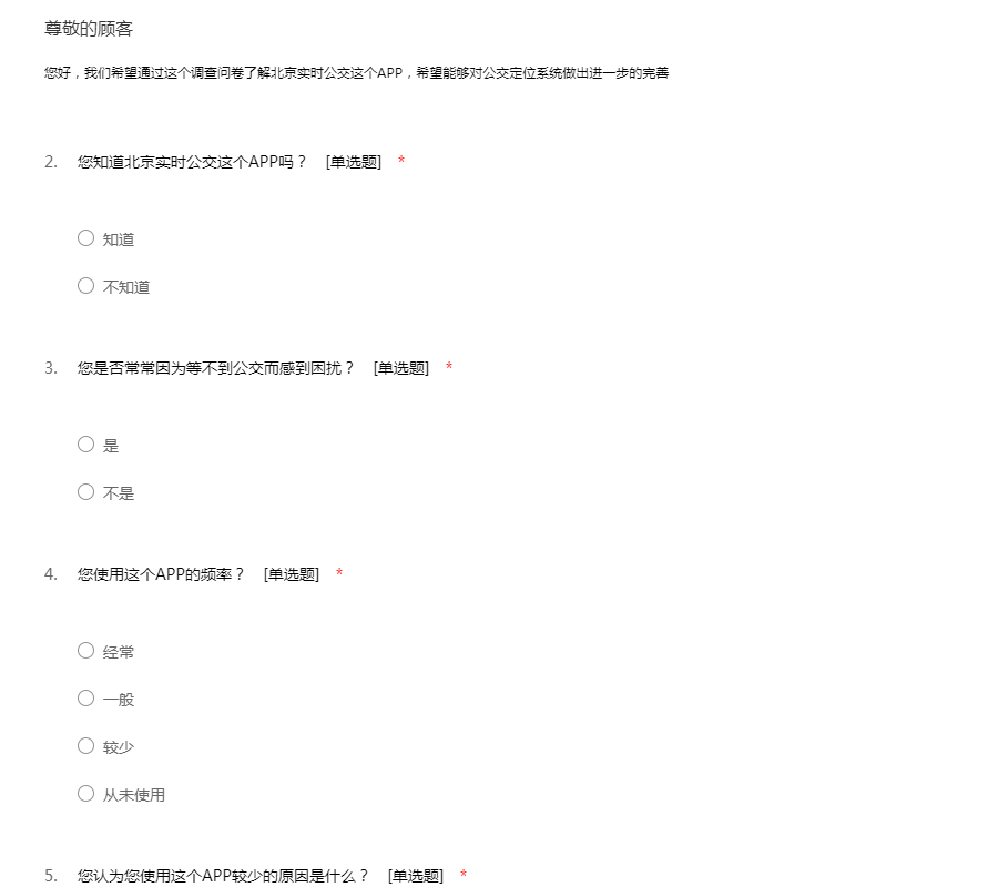 您好,我们希望通过这个调查问卷了解北京实时公交这个APP,希望能够对公交定位系统做出进一步的完善