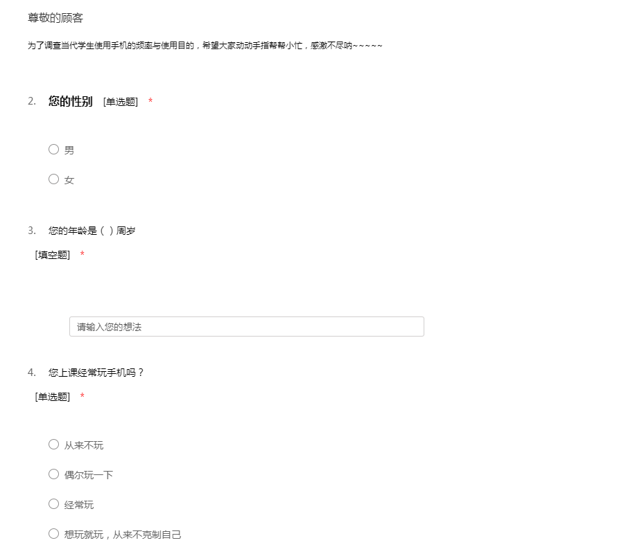 为了调查当代学生使用手机的频率与使用目的,希望大家动动手指帮帮小忙,感激不尽呐~~~~~