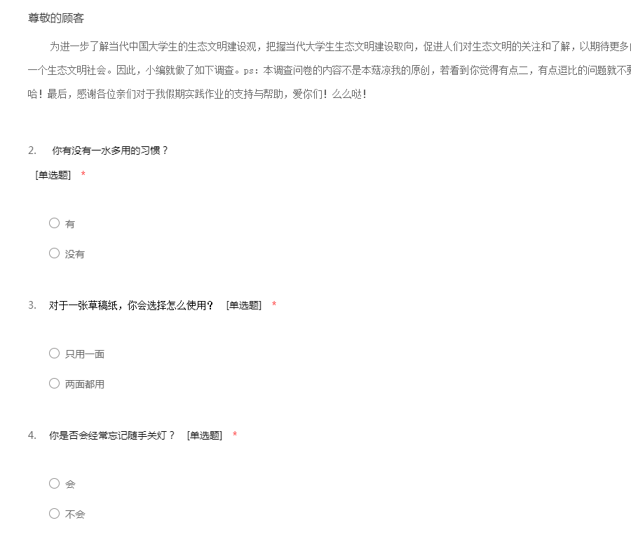 为进一步了解当代中国大学生的生态文明建设观,把握当代大学生生态文明建设取向,促进人们对生态文明的关注和了解,以期待更多的人能够投入到生态文明建设中来,建设一个生态文明社会。因此,小编就做了如下调查。ps:本调查问卷的内容不是本菇凉我的原创,若看到你觉得有点二,有点逗比的问题就不要取笑我了,因为我也是奉命行事。哈哈!最后,感谢各位亲们对于我假期实践作业的支持与帮助,爱你们!么么哒!