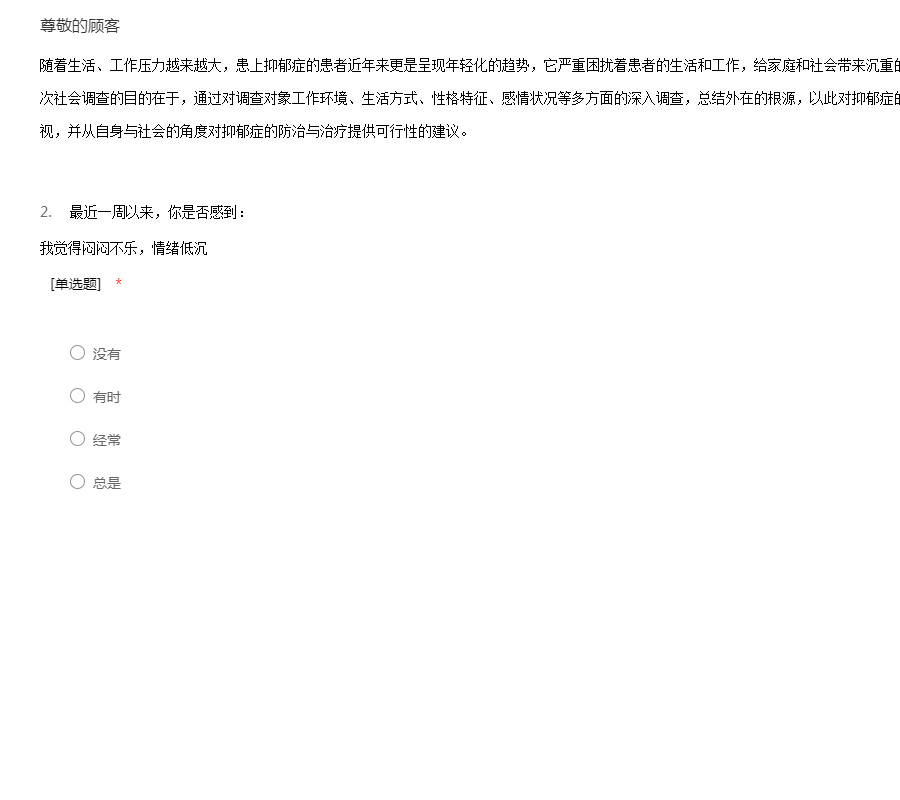 随着生活、工作压力越来越大,患上抑郁症的患者近年来更是呈现年轻化的趋势,它严重困扰着患者的生活和工作,给家庭和社会带来沉重的负担,约50%的抑郁症患者死于自杀,本次社会调查的目的在于,通过对调查对象工作环境、生活方式、性格特征、感情状况等多方面的深入调查,总结外在的根源,以此对抑郁症的年轻化进行剖析,旨在引起足够的重视,并从自身与社会的角度对抑郁症的防治与治疗提供可行性的建议。