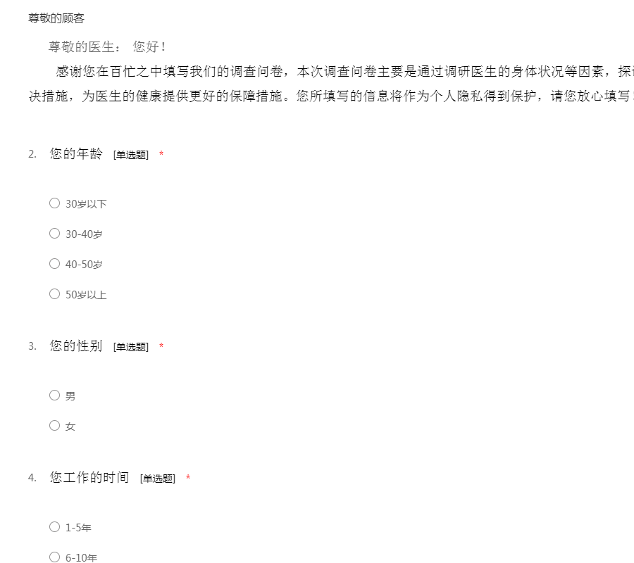 尊敬的医生: 您好! 感谢您在百忙之中填写我们的调查问卷,本次调查问卷主要是通过调研医生的身体状况等因素,探讨医生行业的职业病及相关解决措施,为医生的健康提供更好的保障措施。您所填写的信息将作为个人隐私得到保护,请您放心填写!