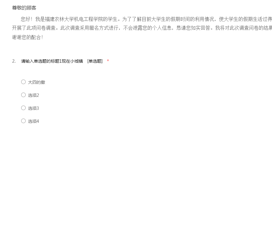 您好!我是福建农林大学机电工程学院的学生。为了了解目前大学生的假期时间的利用情况,使大学生的假期生活过得更多姿多彩,使大学生活更有意义,开展了此项问卷调查。此次调查采用匿名方式进行,不会泄露您的个人信息,恳请您如实回答。我将对此次调查问卷的结果进行整理分析,并形成调查报告。谢谢您的配合!