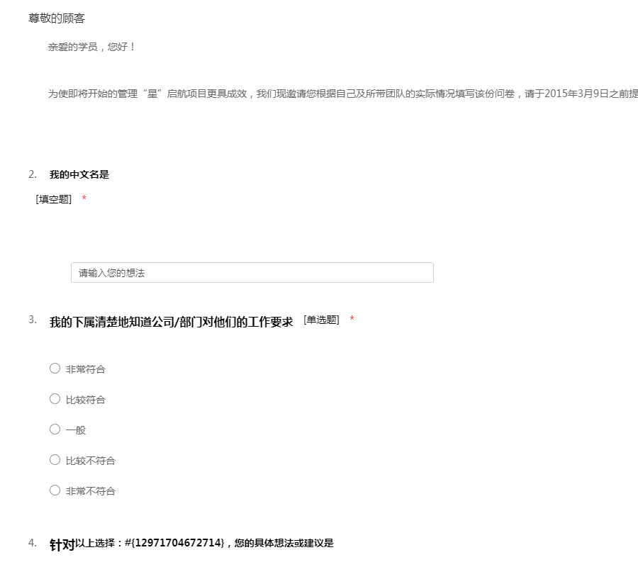 亲爱的学员,您好! 为使即将开始的管理“星”启航项目更具成效,我们现邀请您根据自己及所带团队的实际情况填写该份问卷,请于2015年3月9日之前提交问卷。谢谢! 人力资源培训及发展部