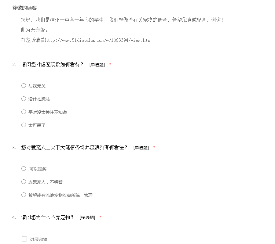 您好,我们是漳州一中高一年段的学生,我们想做些有关宠物的调查,希望您真诚配合,谢谢! 此为无宠版。