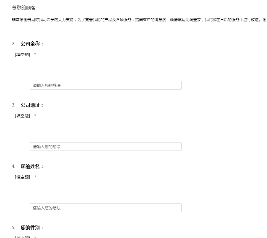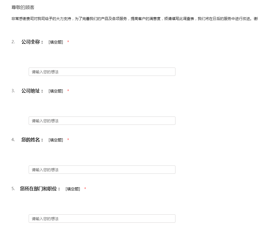 非常感谢贵司对我司给予的大力支持,为了完善我们的产品及各项服务,提高客户的满意度,烦请填写此调查表,我们将在日后的服务中进行改进。谢谢您的支持和参与!