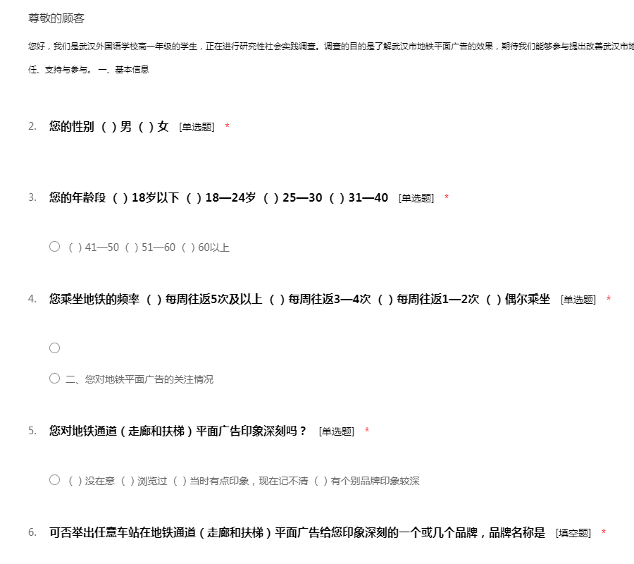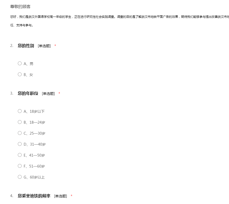 您好,我们是武汉外国语学校高一年级的学生,正在进行研究性社会实践调查。调查的目的是了解武汉市地铁平面广告的效果,期待我们能够参与提出改善武汉市地铁平面广告传播环境的建设性意见。谢谢您的信任、支持与参与。