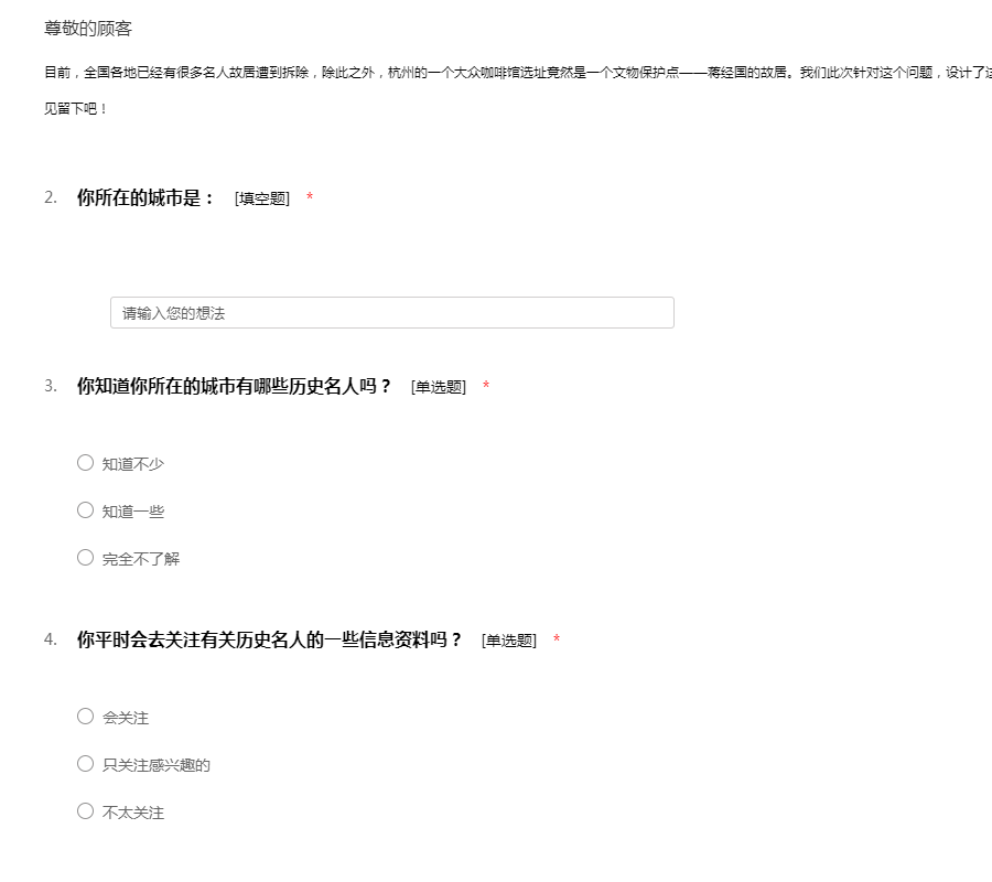 目前,全国各地已经有很多名人故居遭到拆除,除此之外,杭州的一个大众咖啡馆选址竟然是一个文物保护点——蒋经国的故居。我们此次针对这个问题,设计了这份问卷调查表。希望大家能积极参与,把你的意见留下吧!