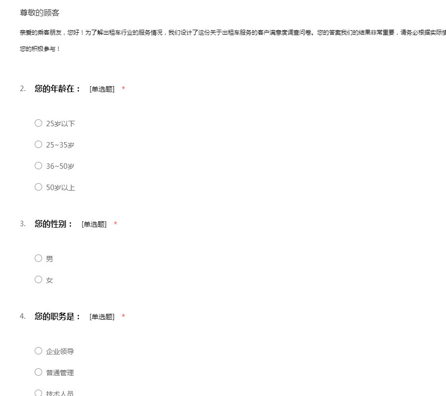 亲爱的乘客朋友,您好!为了解出租车行业的服务情况,我们设计了这份关于出租车服务的客户满意度调查问卷。您的答案我们的结果非常重要,请务必根据实际情况填答。问卷不记名,所以不必有所顾虑。感谢您的积极参与!