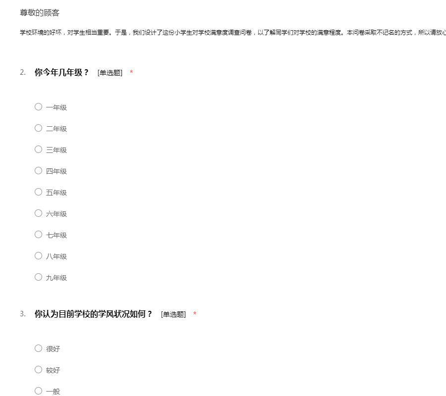 学校环境的好坏,对学生相当重要。于是,我们设计了这份小学生对学校满意度调查问卷,以了解同学们对学校的满意程度。本问卷采取不记名的方式,所以请放心填写。感谢你的参与!